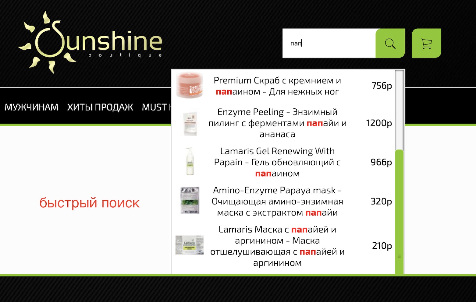 После установки модуля "Быстрый поиск" (ещё называют "умный поиск" для интернет магазинов на платформе InSales, или "живой поиск для InSales") клиенту, чтобы просмотреть результаты поиска, не нужно будет переходить на страницу поиска (перезагрузка страницы занимает время, а мы это время для клиента сэкономим) + страничка станет более интерактивной и удобной для использования.