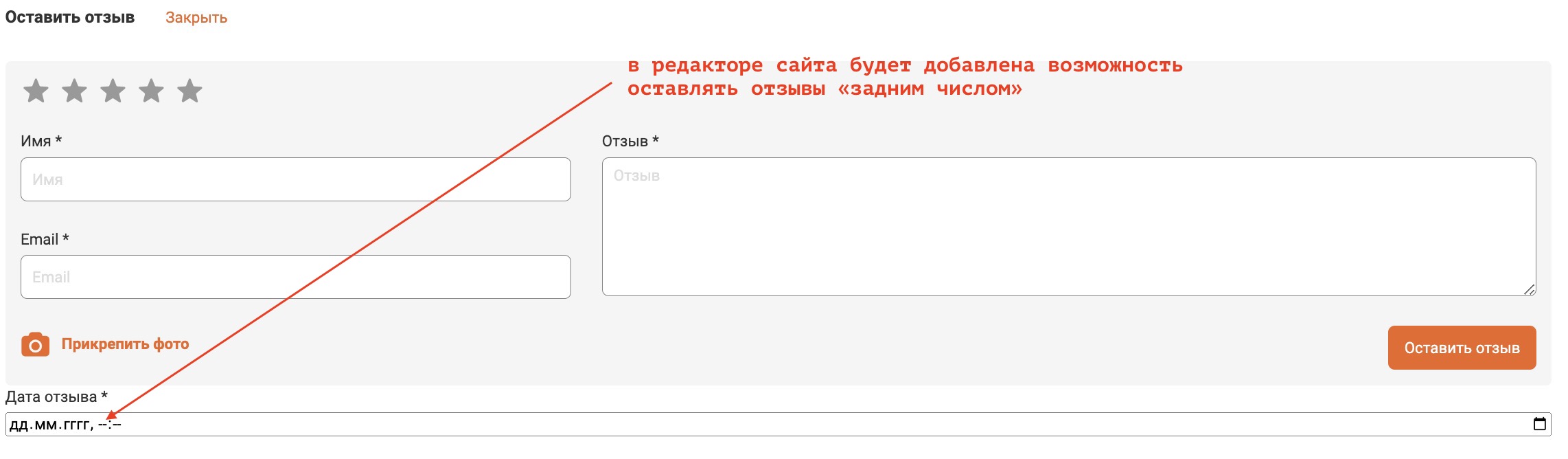 Можно будет добавить отзывы и из других источников, например из соцсетей, маркетплейсов. Чтобы можно было добавить отзывы "задним числом" мы проведем доработку форм, Вы сможете указывать дату написания отзыва (из редактора сайта).