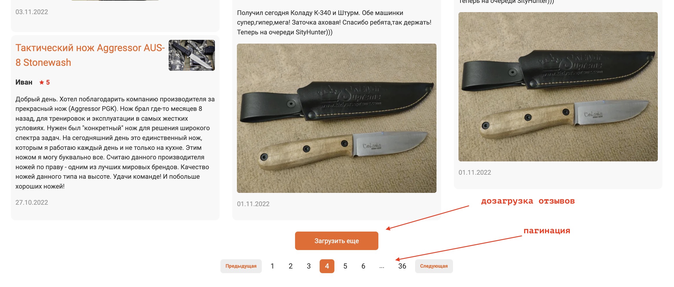 Пагинация и быстрая дозагрузка отзывов. Возможность писать отзывы "задним" числом.
