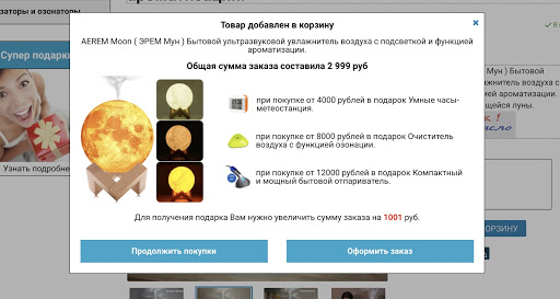 Управление: в бэк офисе Вы сможете выбрать до 3-ёх подарков и прописать им значение суммы заказа, после которого добавляется соответствующий подарок. Например можно настроить, что при покупке на 1000р - выдается один подарок, при покупке на 5000 р он меняется на другой, более интересный для покупателя, и меняется на третий при достижении суммы заказа 10000р.